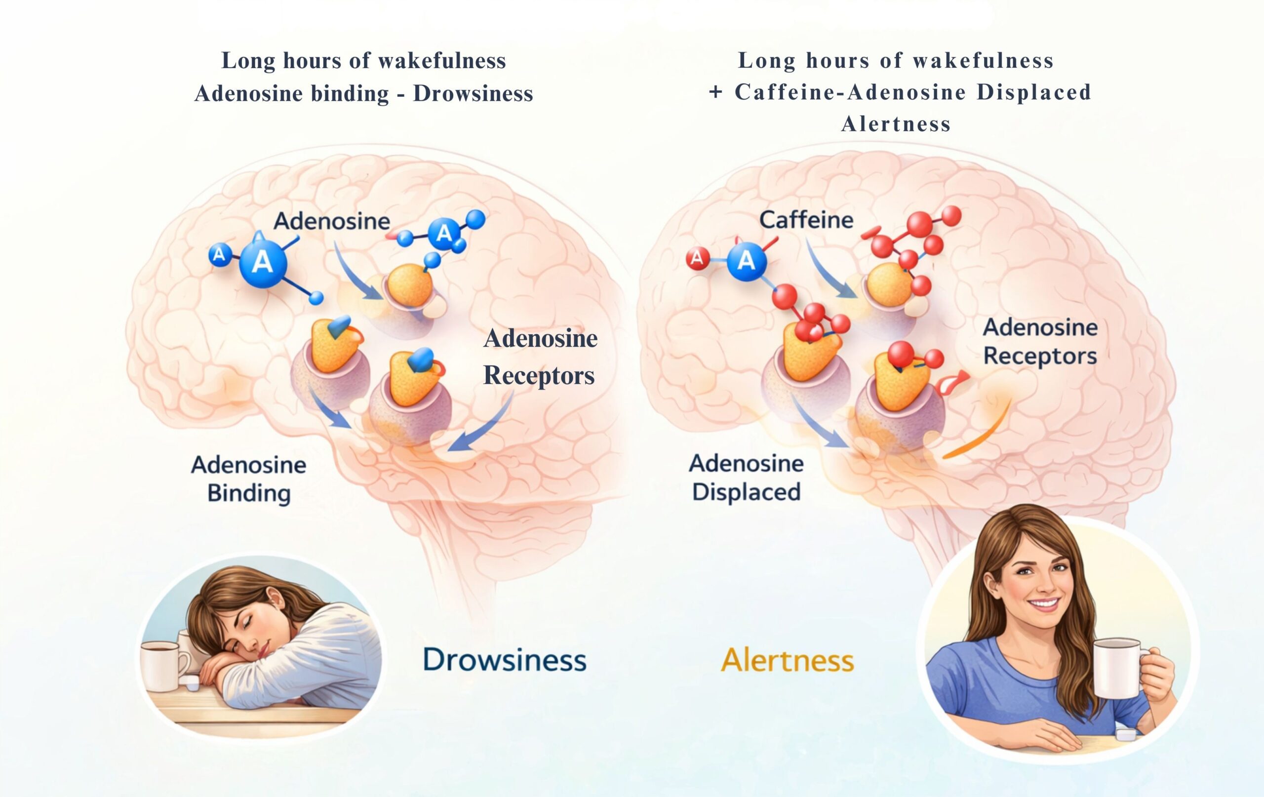 • Blocking adenosine signalling reduces neuronal inhibition and increases neuronal activity, promoting wakefulness and alertness.